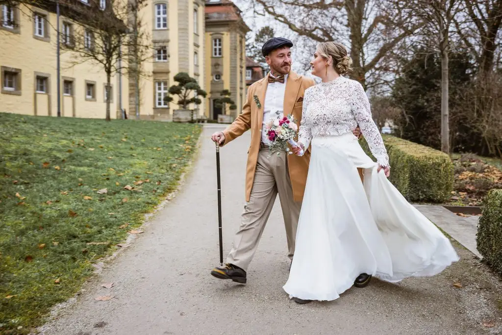 Ein Brautpaar steht draußen vor einem Backstein Schloss und küsst sich dramatisch